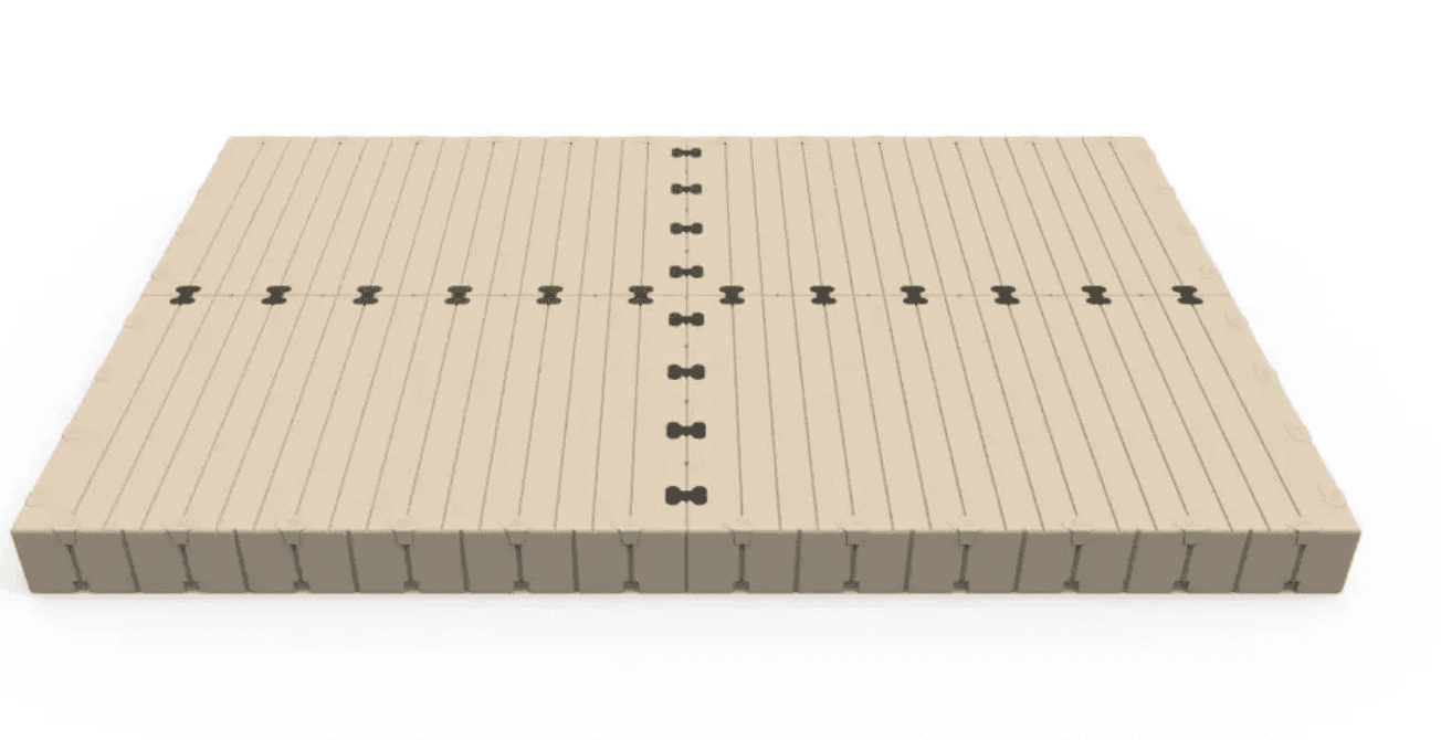 The patented EZ Dock system makes it a snap to install. Just lay out the sections bolt couplers in place and tighten the bolts. Available in beige (standard) or gray (special order). Includes part #: • 208010 80″ X 10′ Dock Section (4) • 301100 Coupler Set (20)
