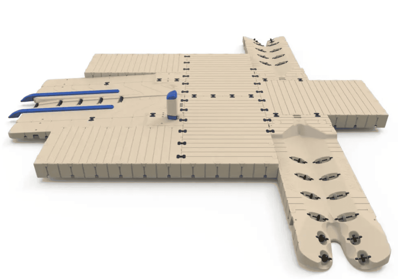 The patented EZ Dock system makes it a snap to install. Just lay out the sections bolt couplers in place and tighten the bolts. Available in beige (standard) or gray (special order). Includes part #: • 206010 60″ X 10′ Dock Section (2) • 208010 80″ X 10′ Dock Section (2) • BP5000-M EX BoatPort 5000 pkg 10′ x 20’6″ (choice of bunk length) includes manual 110V AC air-assist pump (1) • 301100 Coupler Set (26)