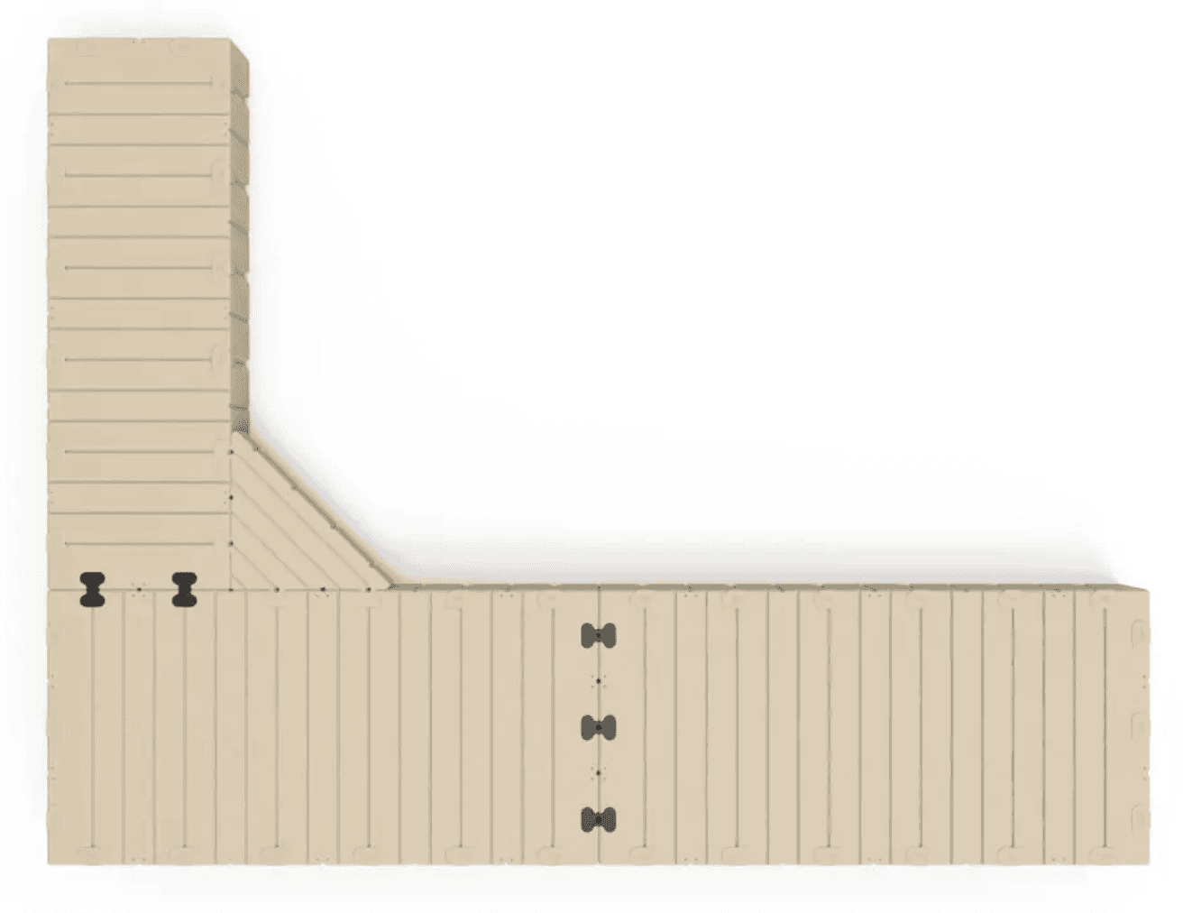 The patented EZ Dock system makes it a snap to install. Just lay out the sections bolt couplers in place and tighten the bolts. Available in beige (standard) or gray (special order). Includes part #: • 206010 60″ X 10′ Dock Section (2) • 204010  40″ X 10′ Dock Section (1) • 300501 Corner Gusset (1) • 301100 Coupler Set (5)