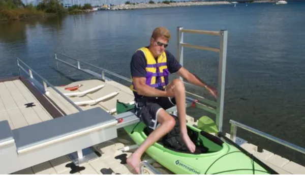 The Transfer Bench is built with two heights for easy transfer from wheelchairs of varying sizes and two Transfer Slide Boards to accommodate differing watercraft heights. The Transfer Slide Boards land securely on a railing system that stabilizes the slide board and provides grab bar assistance for easy side movement. All users can simply sit slide over and drop down into a kayak or canoe then utilize the side rails to pull off or back on.