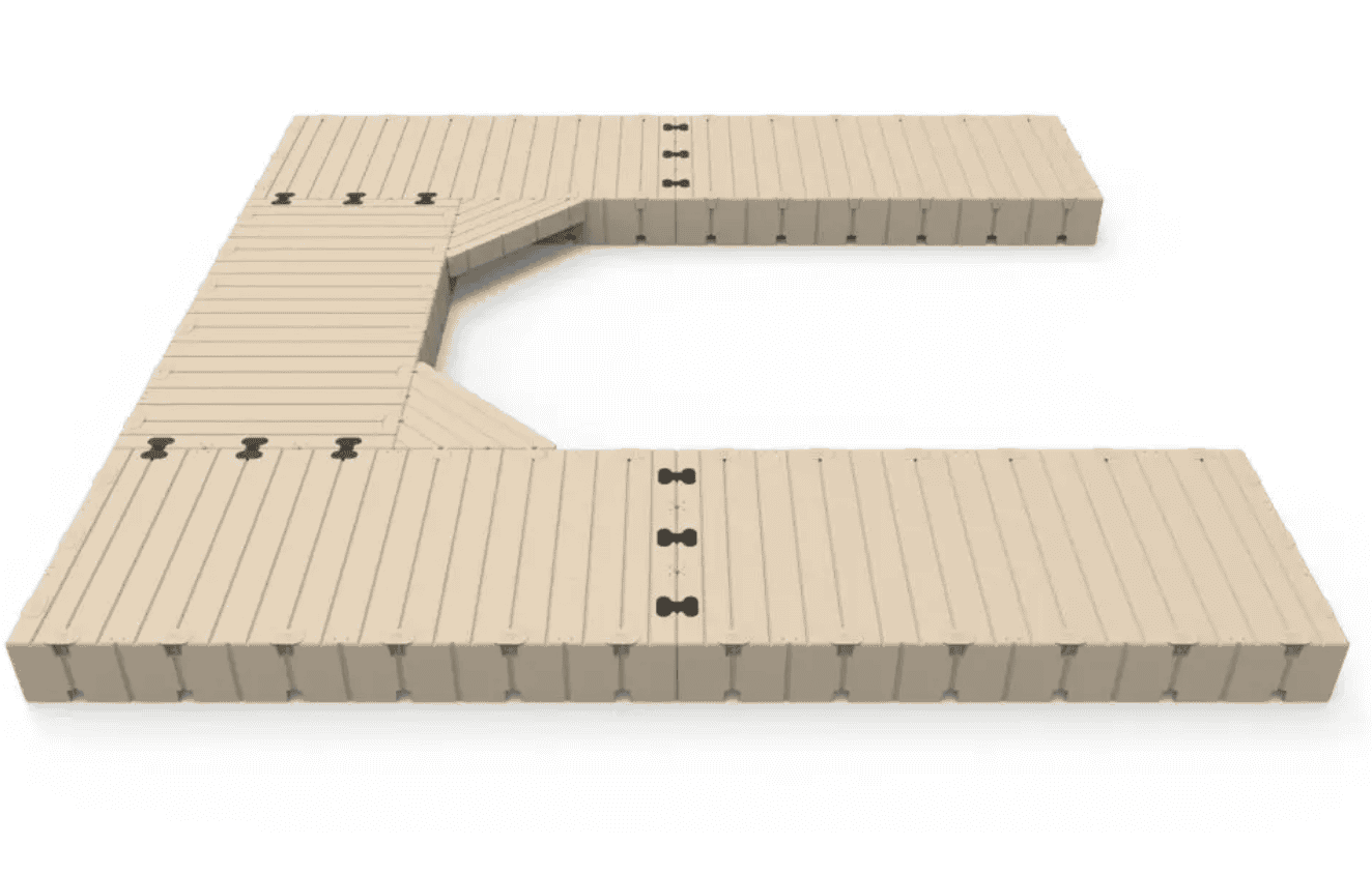 The patented EZ Dock system makes it a snap to install. Just lay out the sections bolt couplers in place and tighten the bolts. Available in beige (standard) or gray (special order). Includes part #: • 206010 60″ X 10′ Dock Section (5) • 300501 Corner Gusset (2) • 301100 Coupler Set (12)