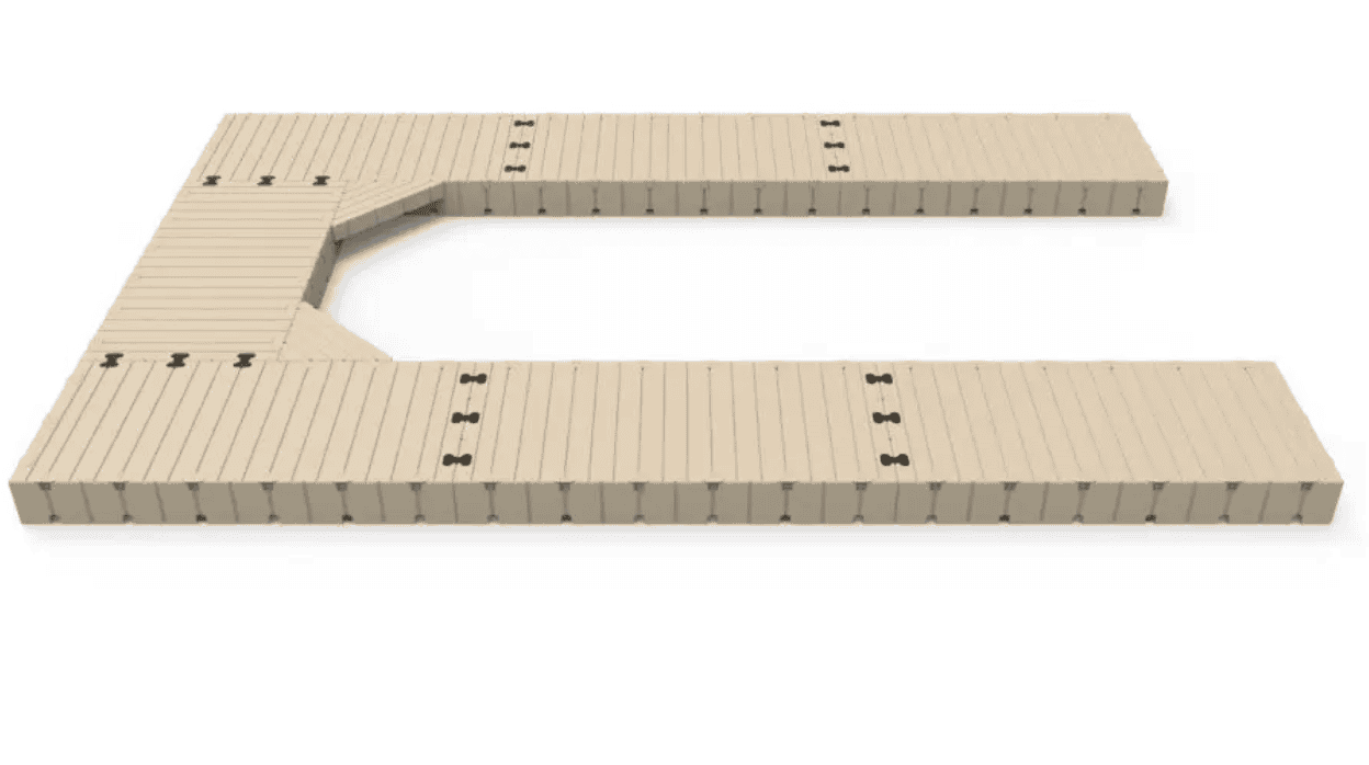 The patented EZ Dock system makes it a snap to install. Just lay out the sections bolt couplers in place and tighten the bolts. Available in beige (standard) or gray (special order). Includes part #: • 206010 60″ X 10′ Dock Section (6) • 208010 80″ X 10′ Dock Section (1) • 300501 Corner Gusset (2) • 301100 Coupler Set (20)
